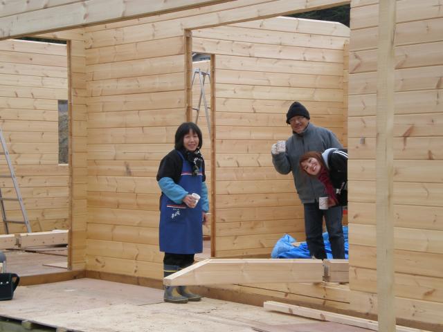 Note the "C" wall log lying on the floor, ready for installation. If you look closely, you can see the insulation already wrapped round the joint.
